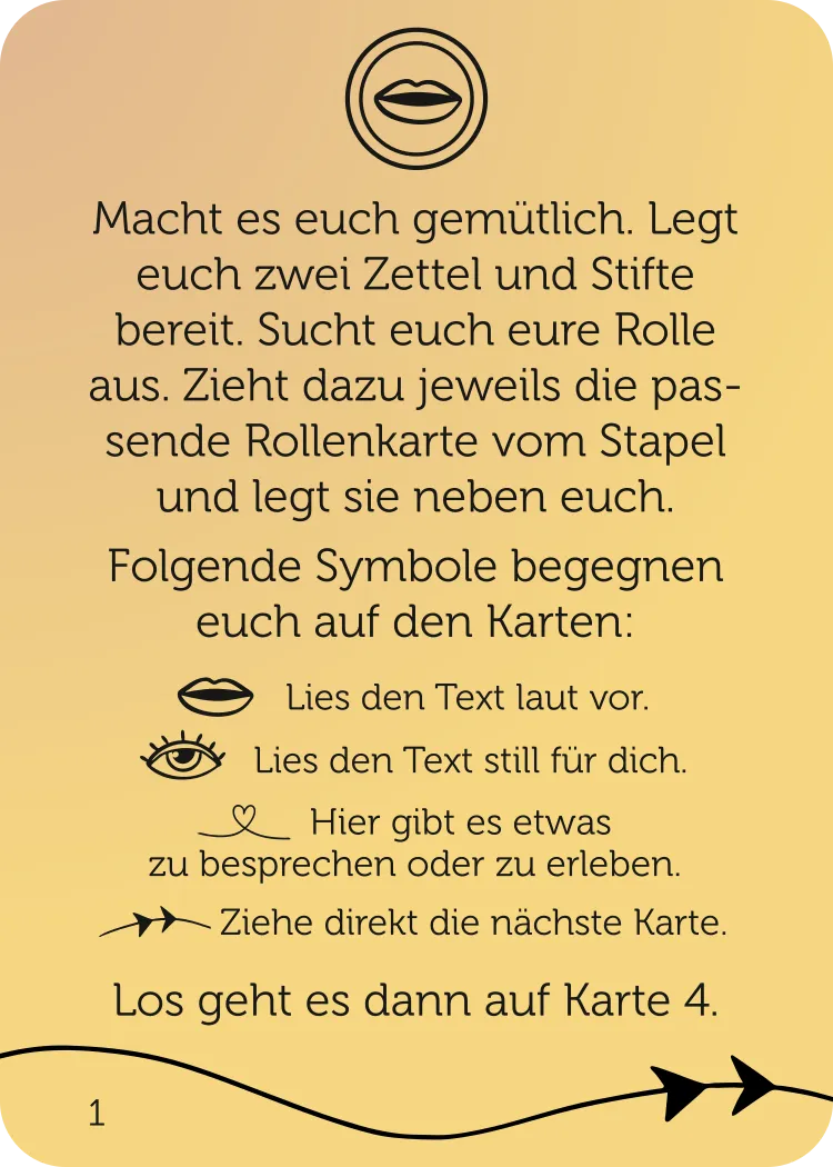 Ja – und zwar sehr gut: Einmal in vertauschten Rollen ist bereits eine neue Erfahrung. Für manche Inhalte brauchst du etwas Abstand – daher empfehlen wir Wiederholungen mit Pausen dazwischen. Drei Ausfüllkarten sind bewusst doppelt beigelegt.